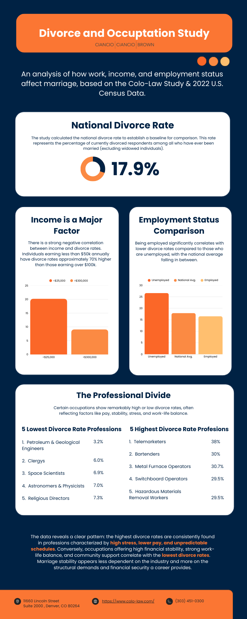 Of course, a job itself is not the sole cause for a divorce. Bartenders and restaurant servers, for example, don’t have higher divorce rates because anything about the act of making drinks or serving food is inherently harmful to a marriage.